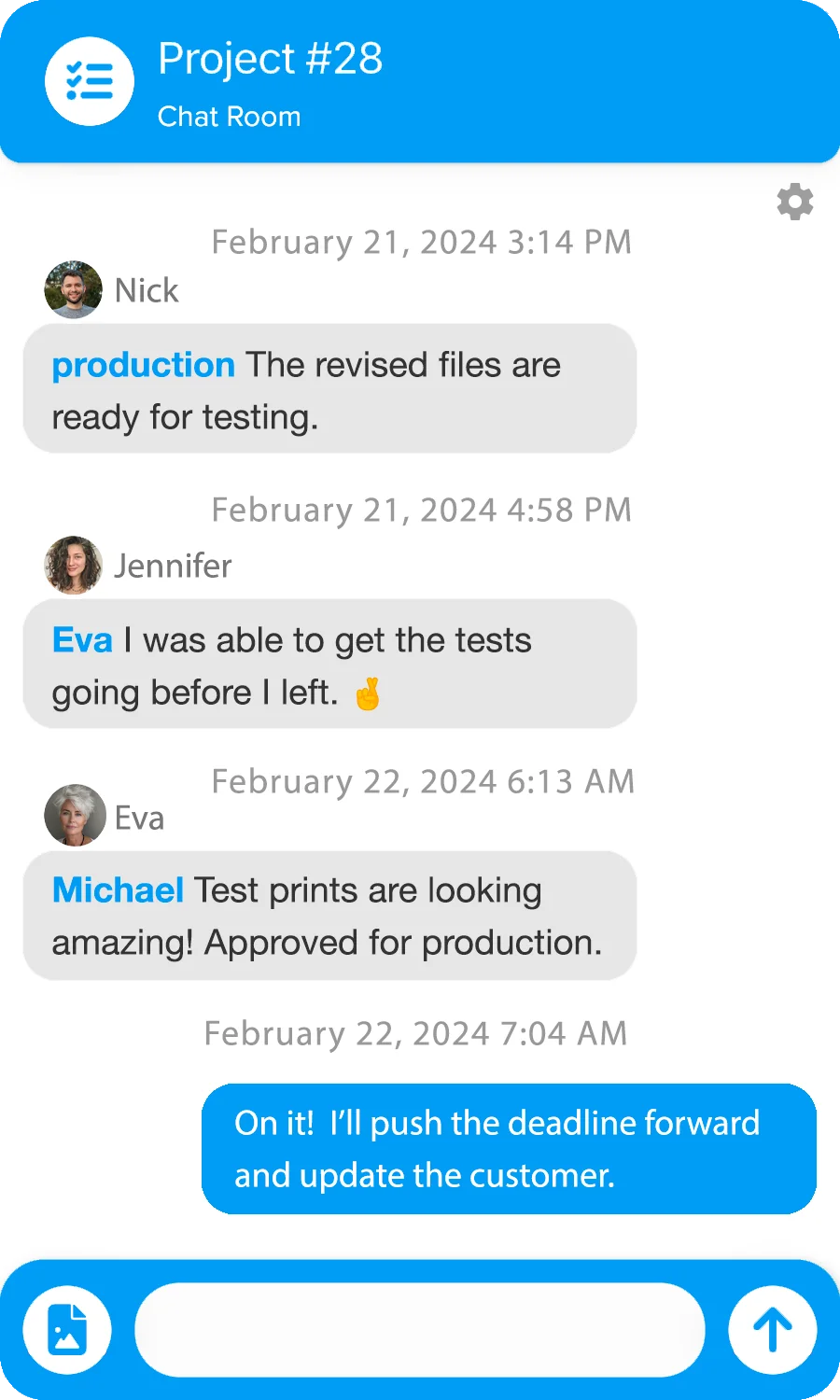 Chatrooms for every project. Automated e-mail updates and paperwork.