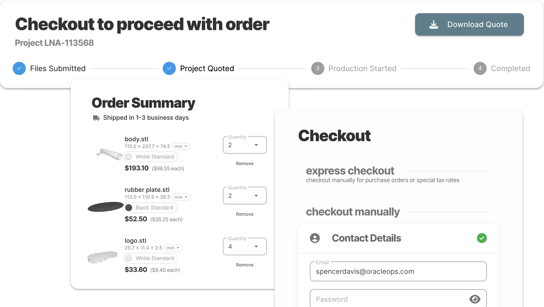 Tailored checkout system complete with automatic shipping, tax calculations, and document handling. Leverage integrations with Stripe and Quickbooks for a safe and smooth transaction process.
