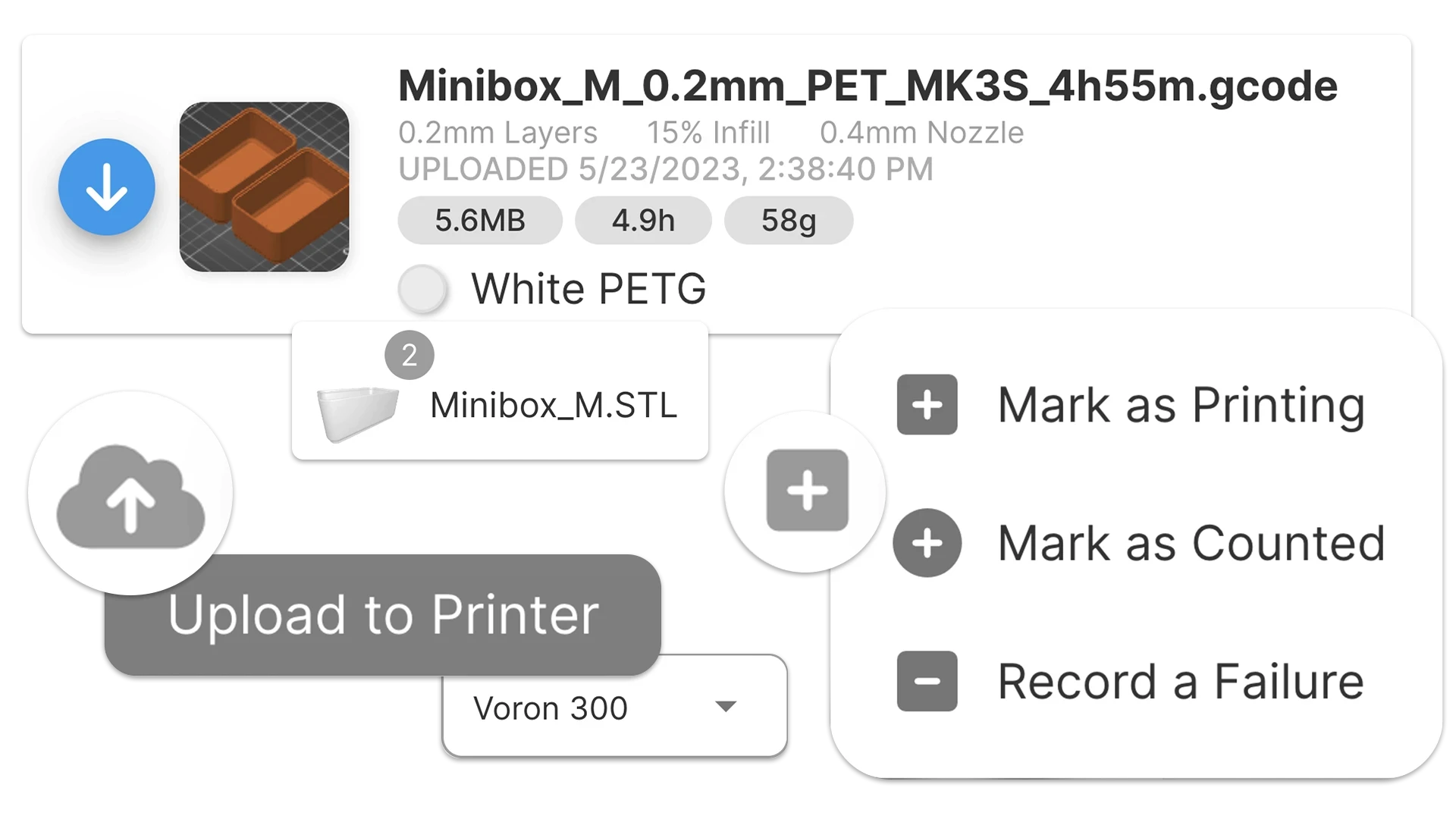 Connect supported 3D printers to view live updates and track your upcoming jobs